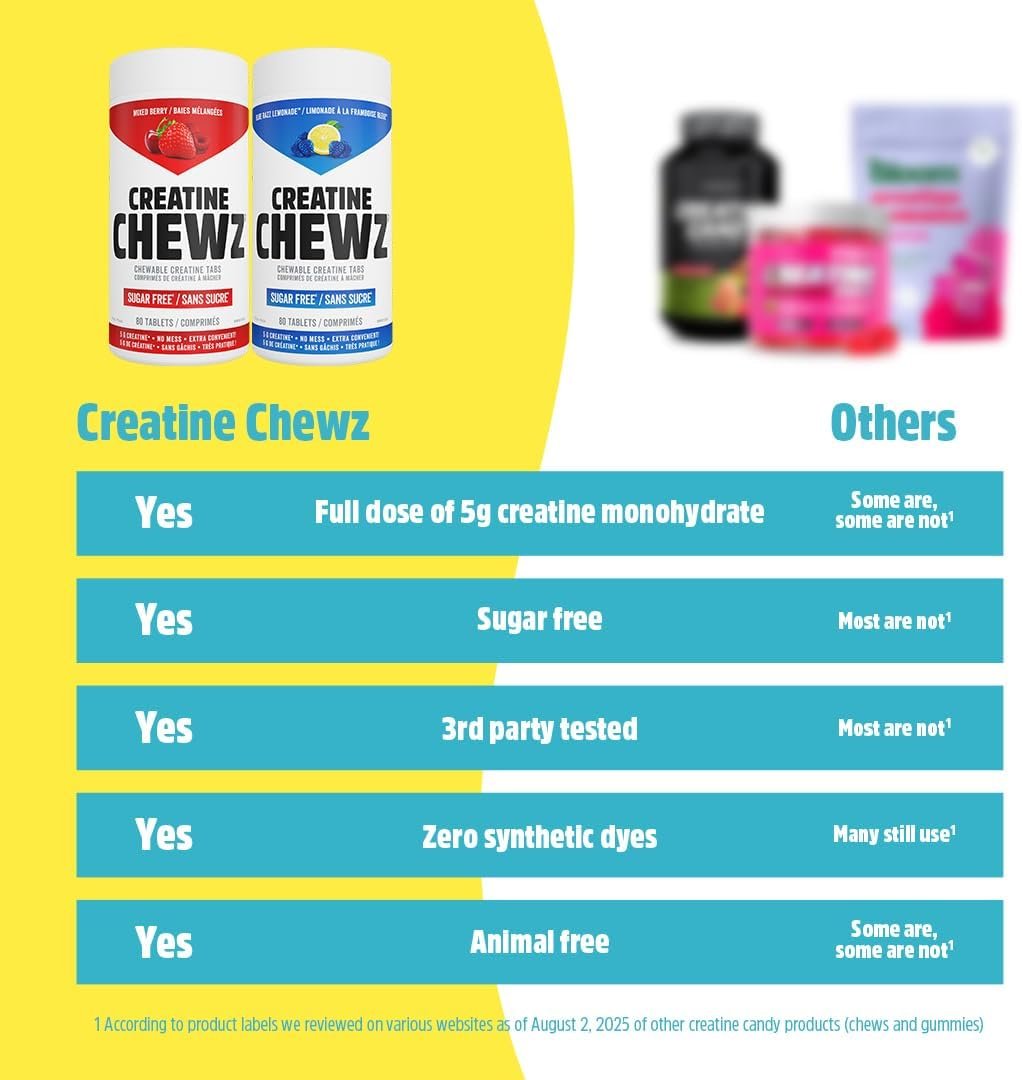 - ไม่ใช่กัมมี่: ทางแบรนด์เคลมว่าเป็นเม็ดเคี้ยวที่ไม่เหนียวติดฟันเหมือนครีเอทีนรูปแบบกัมมี่ (Gummy) ทั่วไป