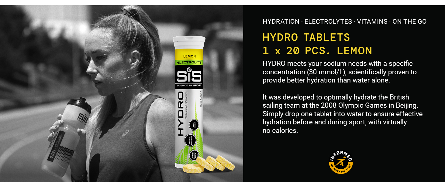 Science in Sport (SiS) GO Hydro Electrolyte Tablets คือ เม็ดฟู่ (Effervescent Tablets) สำหรับชงเครื่องดื่มเกลือแร่หรืออิเล็กโทรไลต์ ที่ออกแบบมาเพื่อช่วยให้นักกีฬาและผู้ที่ออกกำลังกาย รักษาระดับความชุ่มชื้น (Hydration) ได้อย่างมีประสิทธิภาพ โดยไม่ได้รับแคลอรี่หรือคาร์โบไฮเดรตในปริมาณมาก