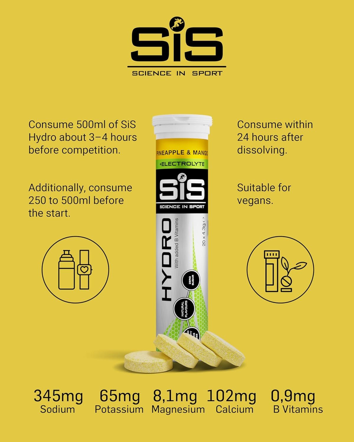 ปริมาณ: เติม 1 เม็ด SiS GO Hydro ลงในน้ำ 500 มล. และปล่อยให้ละลาย